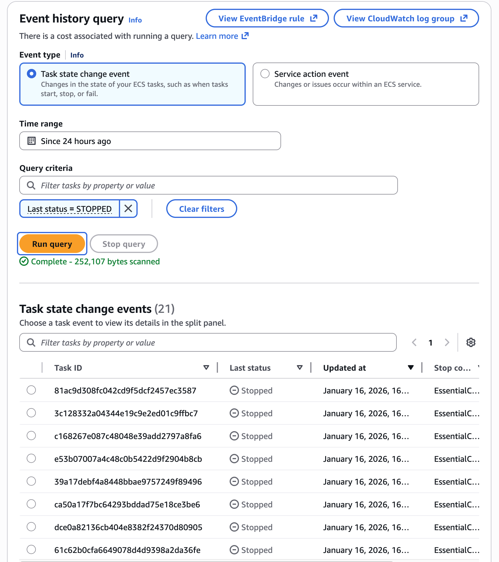 In October, Amazon Web Services announced a new user-friendly feature to display and query event history for Elastic Container Service in the console. Unfortunately, there isn't an API to configure this functionality, so it's not supported by by Infrastructure-as-Code systems like Terraform1. This blog post is a quick tutorial on how to set up ECS Event Capture using Terraform and some elbow grease.