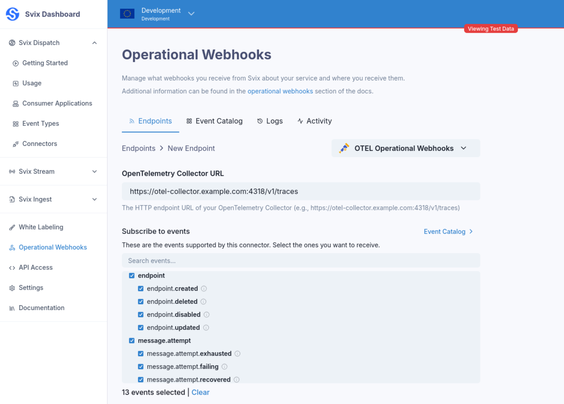 If you register an endpoint using the "OTEL Operational Webhooks" Connector, you will receive traces instead of webhooks for the selected event types. Examples include events when endpoints are created (endpoint.created) or updated (endpoint.updated), when message deliveries to your customers are repeatedly failing (message.attempt.failing), or when endpoints are disabled due to repeated failures (endpoint.disabled). This information gives you broad visibility into your customers' usage of Svix, and even the performance of their infrastructure, that you can automatically integrate into your existing application monitoring tools. As always, you can also add your own custom OTEL attributes to the spans using application metadata.