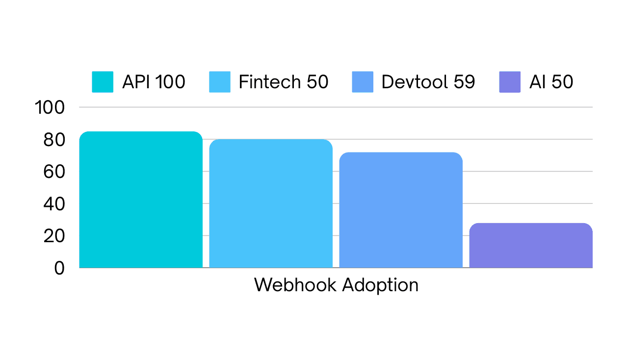 Startups adopt webhooks less than the API 100 across Fintech, Devtools, and AI.